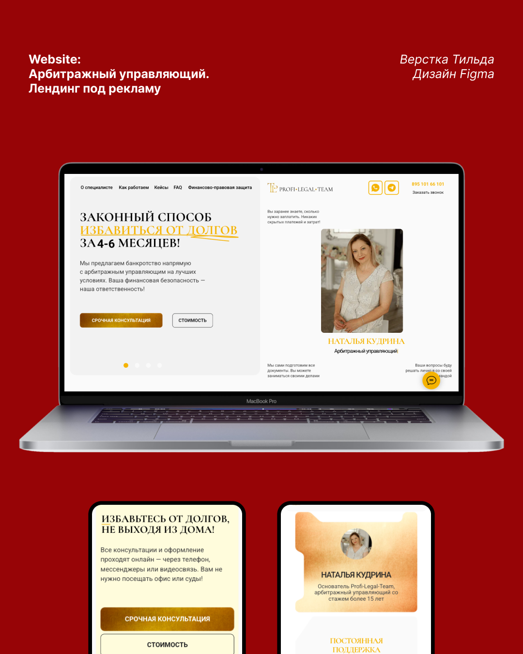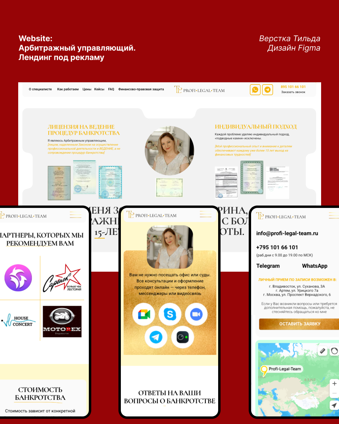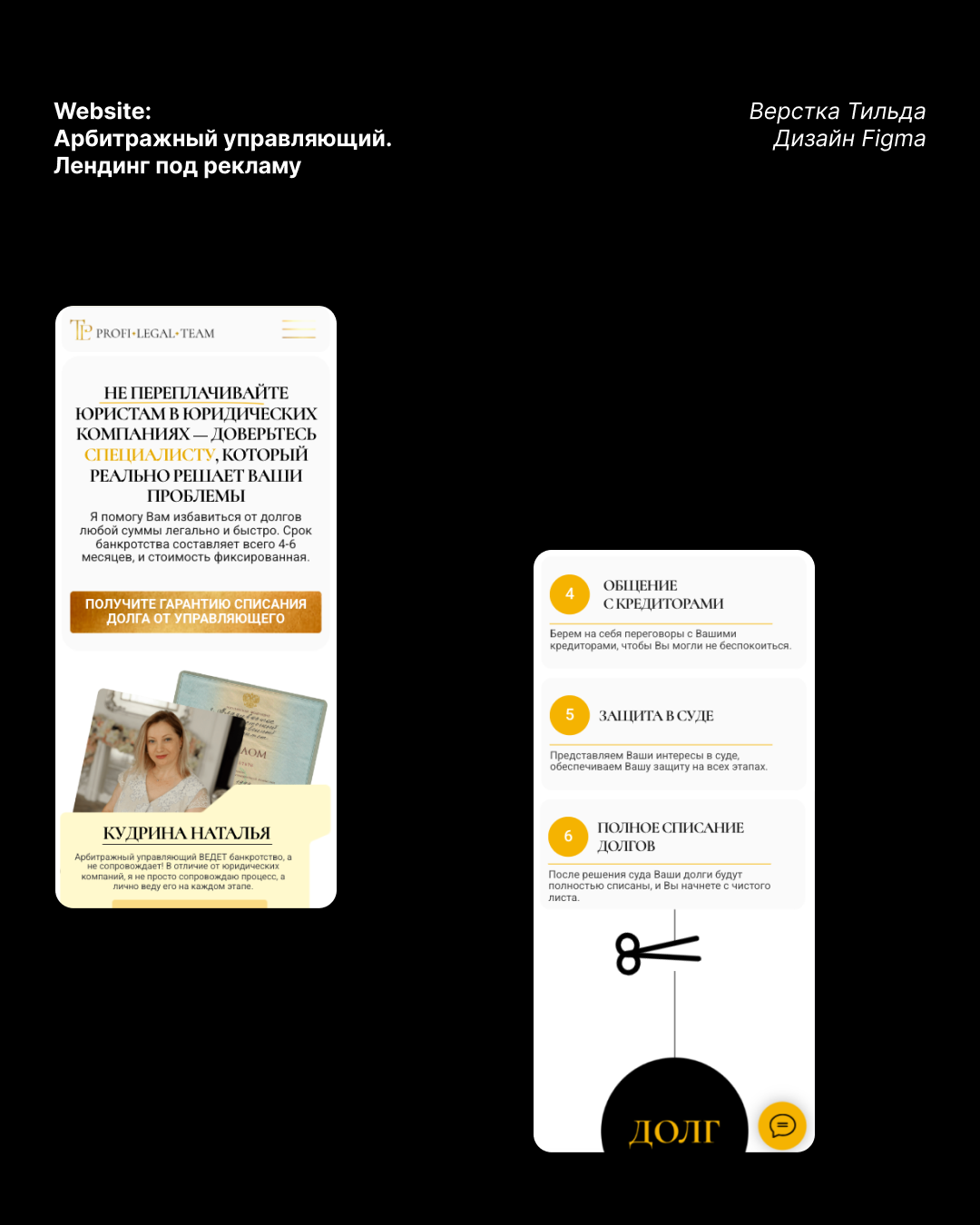 Лендинг для арбитражного управляющего «Profi Legal Team», созданный для продвижения услуг по банкротству и арбитражным процедурам. Разработали дизайн с акцентом на динамику, плавные анимации и метафору юридических папок, адаптированный для верстки на Tilda, с учетом возрастной аудитории 45+ и юридической ниши.