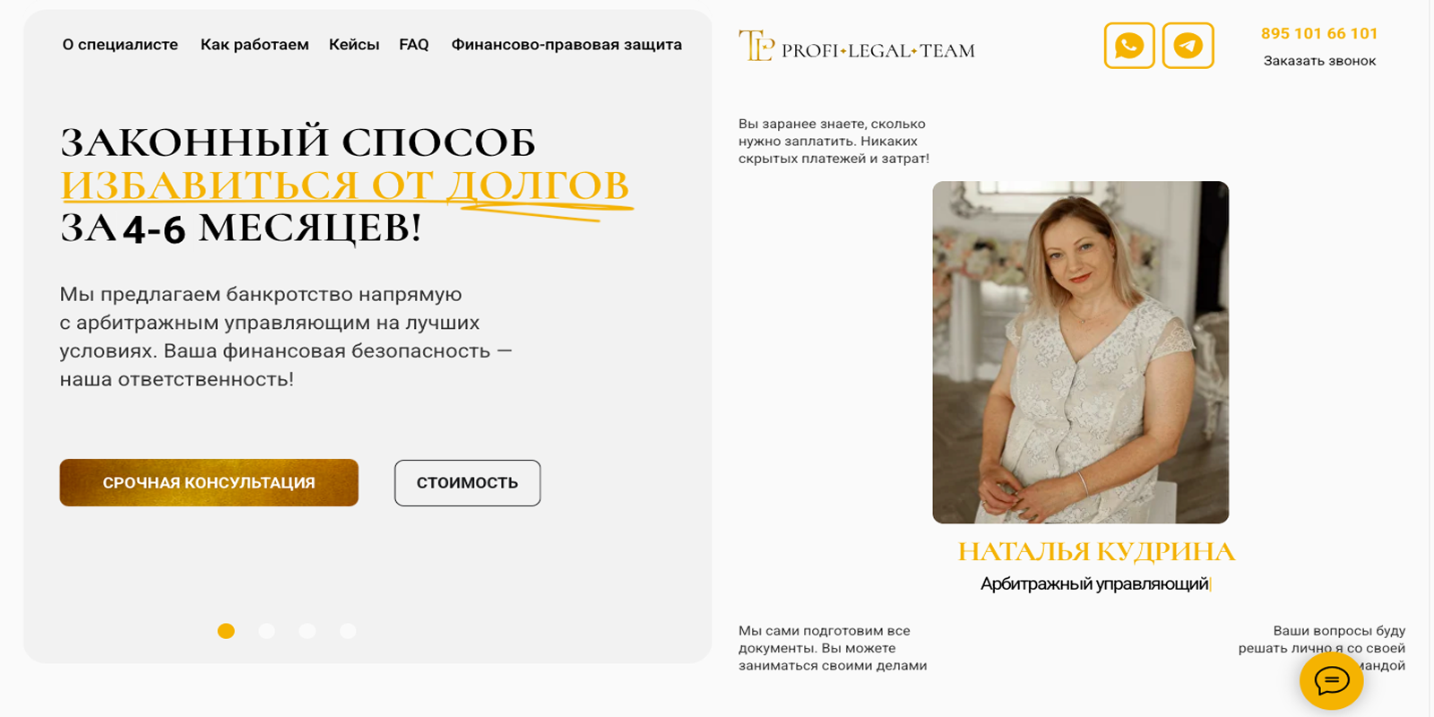 Создать современный сайт для команды арбитражных управляющих «Profi Legal Team», чтобы добавить динамики и движения, сделать его инструментом лидогенерации и продаж услуг. Клиенты — люди 45+, поэтому нужен крупный текст для комфорта чтения (иначе они подумают, что сайт для молодежи с идеальным зрением! 😄). Юридическая ниша требует профессионализма: тексты простые, но грамотные (юристы любят сложный жаргон, но мы упростили, помня, что успех в рекламе — в простоте). Обязательно золото для престижа — кто работал с юристами, тот знает! ✨ Метафора сайта — юридические папки с документами, символизирующие порядок и неспешность (в банкротстве спешка ни к чему: тише едешь — дальше будешь). Сайт должен привлекать клиентов через формы заявок, интеграцию с аналитикой и запуск рекламы, подчеркивая экспертизу в банкротстве.